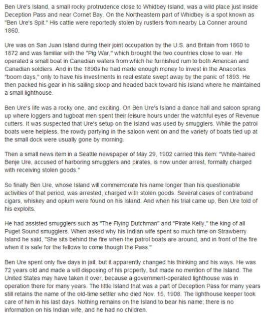 If my same-size sister and I had known that the canoe our neighbors agreed to loan us weighed nearly as much as one of us, we’d have handled things differently. Our plan: to lift, load and transport the dark green Coleman X Scanoe to our destination seven miles away: Cornet Bay, part of Deception Pass State Park, where we’d then unload the behemoth and paddle over to Ben Ure (rhymes with “cur”) Island for a camping adventure. The canoe was not only heavy but so large that its sides extended beyond the three successively larger cars, thus roof racks, from which we had to choose. We finally found a set it would fit (though not well) on our our old Dodge Caravan, half-filled with cedar-smelling brush awaiting transport. The tiny (by my calculation, about 11.5 acres) island to which we were headed is named after an infamous man with a “rocky…exciting”…